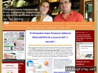 Opis: Strona internetowa e-hip.pl to nic innego jak serwis, którego właścicielem jest wydawnictwo z Krakowa, od 1992 roku zajmujące się głównie wydawaniem Osiedlowych Gazet Informacyjnych HiP. Zamieszcza w nich między innymi reklamy dla zainteresowanych klientów. Poza tym reklamy te proponuje w danym serwisie internetowym. Firmy z Krakowa i okolic mogą tu prezentować swoje oferty zarówno produktów jak i usług.